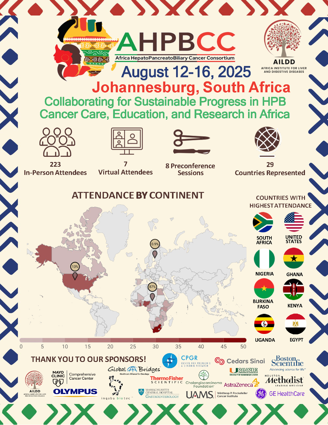 We have solidified funds from several foundations and organizations, including an R13 grant award from the US National Cancer Institute. We are currently soliciting additional support. Specific sponsorship opportunities that may be aligned with your organization’s priorities include early-career investigator travel and funding seed grant collaborations between investigators in Africa and investigators from around the world for studies focused on hepatobiliary and pancreatic cancers.