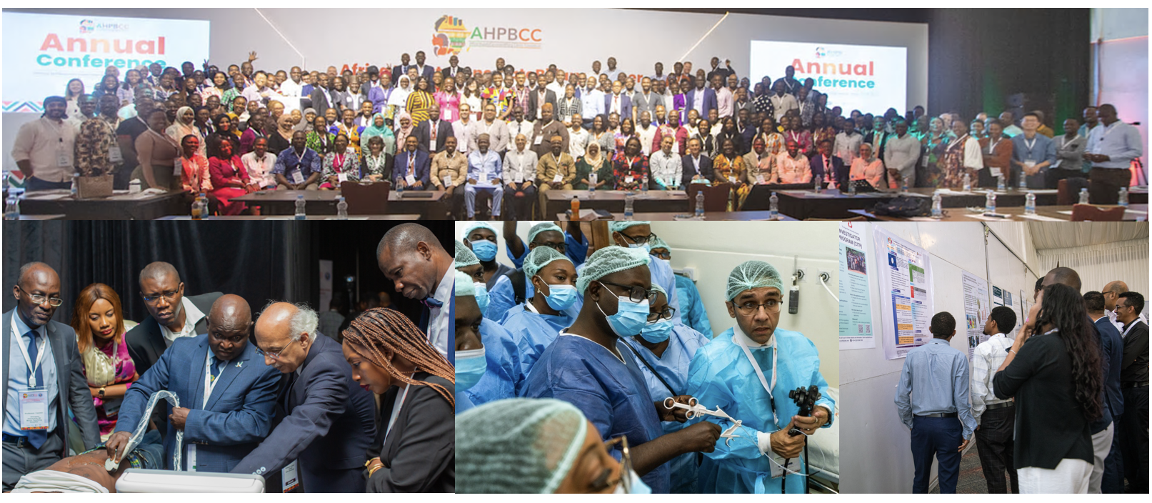 (Top) AHPBCC 2024 conference participants in Mombasa, Kenya. (Bottom left) Hands-on ultrasound workshop using live patient models at the AHPBCC 2022 meeting in Cairo, Egypt. (Bottom middle) Advanced endoscopy training workshop using both simulated models and live patient cases at the AHPBCC 2024 meeting at Coast Central Hospital in Mombasa, Kenya. (Bottom right) Poster session at the AHPBCC 2024 meeting in Mombasa, Kenya, featuring many young investigators and clinicians.